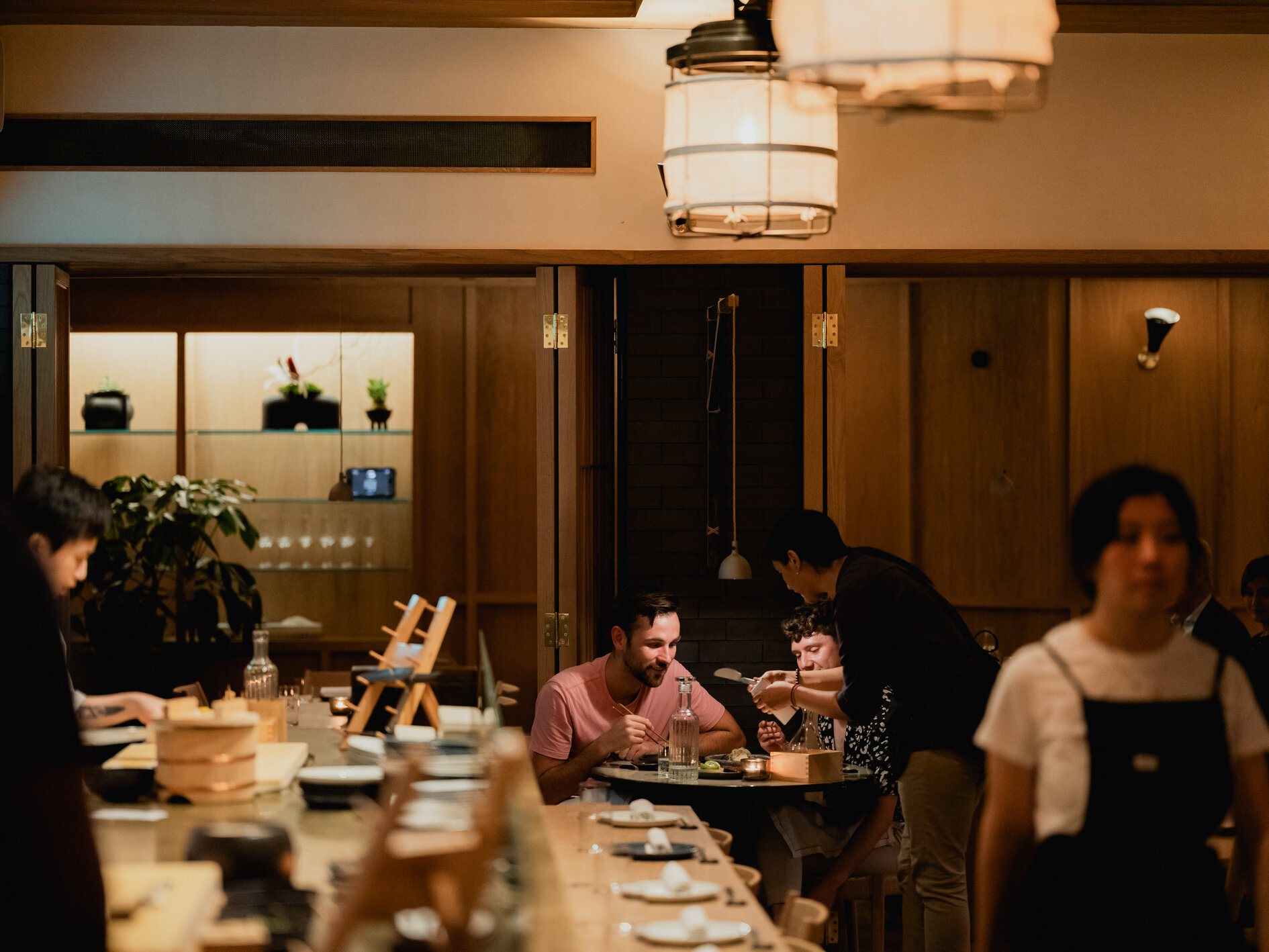 The strikingly designed open dining room is complemented by a sushi counter, hidden b...