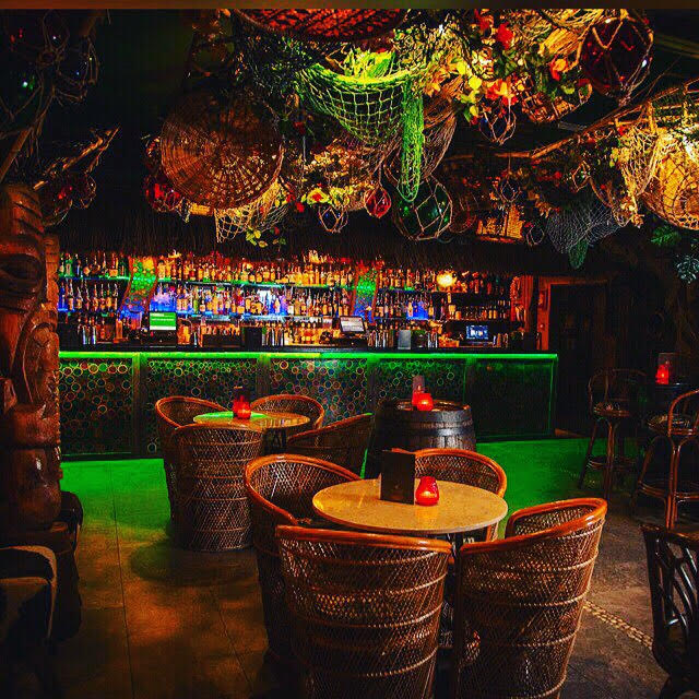Sugar Cane is a tiki bar with all the trimmings: huts as booths, straw chief chairs, tiki statues, exotic flowers, palms, lots of bamboo and woven banana leaves covering the walls, and even tiki face cocktail glasses.
